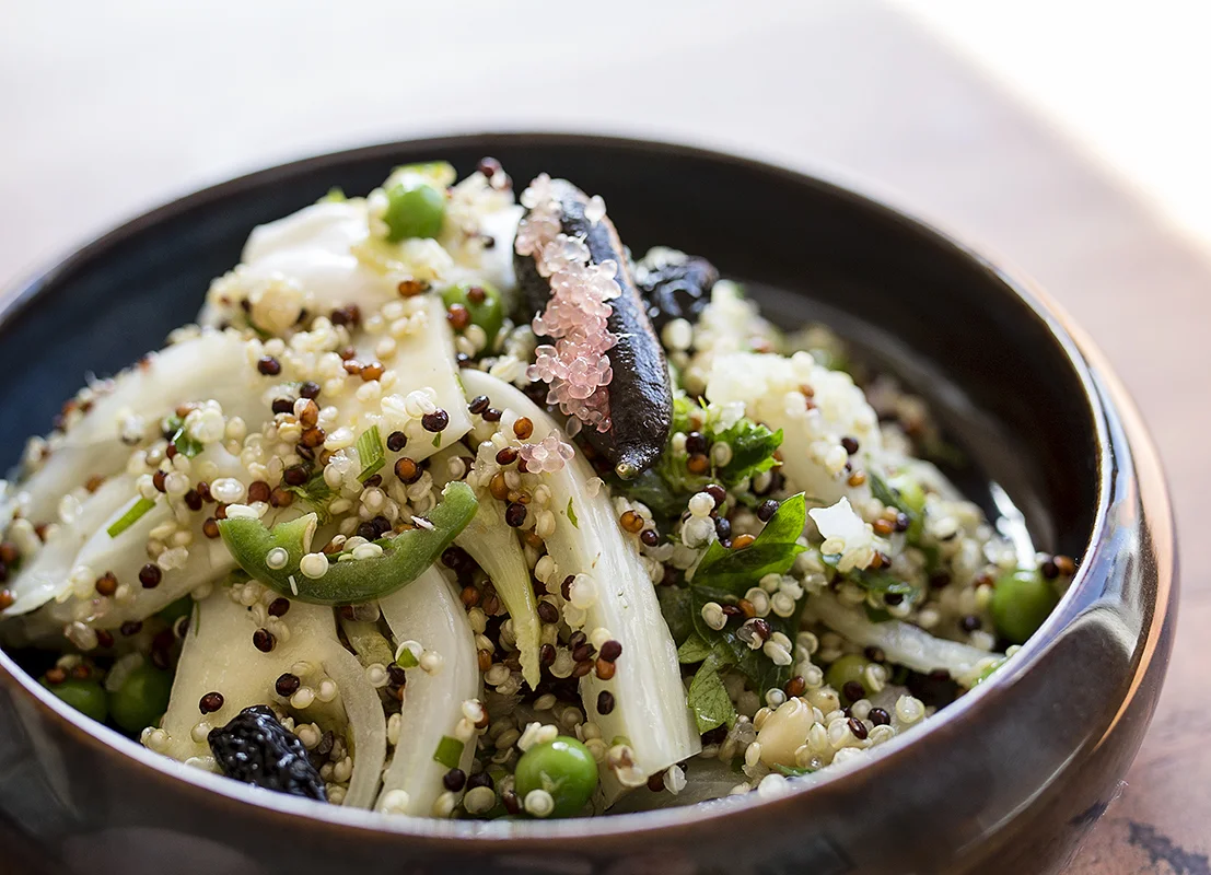 3. Mix in fennel, peas, jalapenos, dried bing cherries, pine nuts, lemon juice, lemon zest, finger limes, parsley, cannabis, and dill. Mix gently and salt and pepper to taste. Serve with a dollop of greek yogurt.